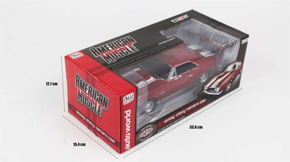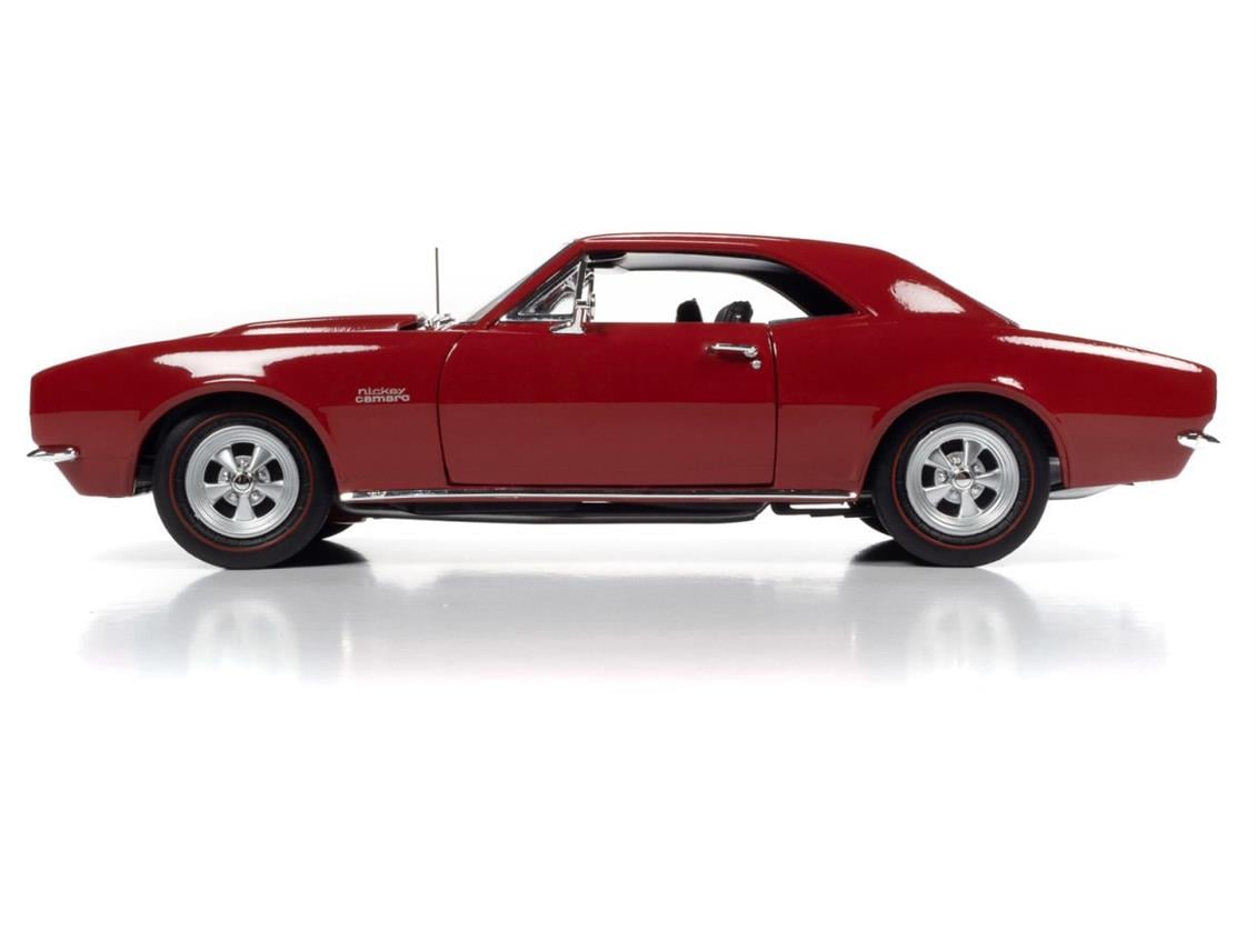 Diecast araç AutoWorld AMM1228 1/18 Ölçek, 1967 Nickey Chevrolet Camaro Z28 (MCACN), Bolero Red, Sergilemeye Hazır Metal Araba Modeli. Uzaktan kumandası yoktur. Gerçek aracın küçültülmüş halidir.