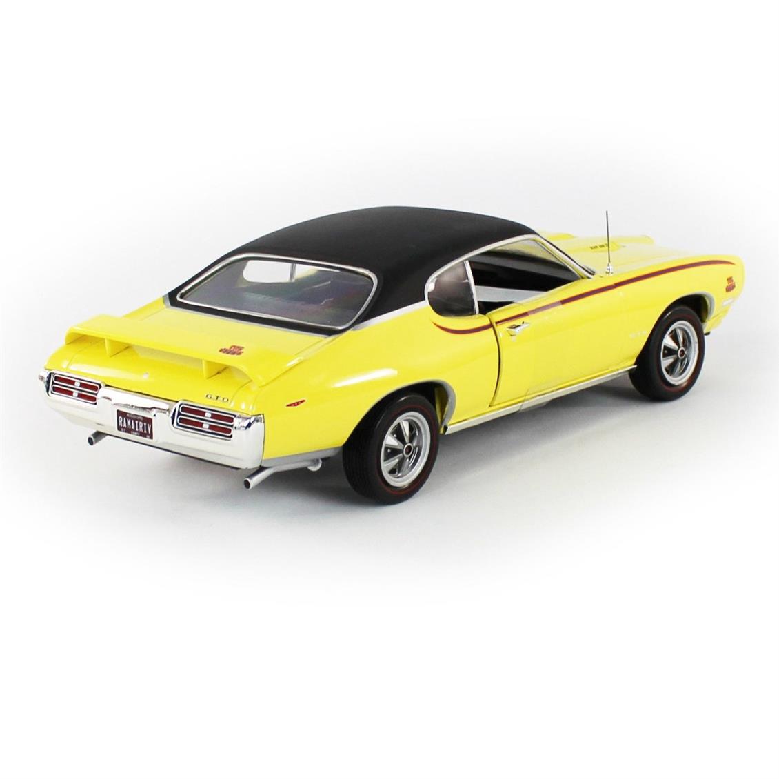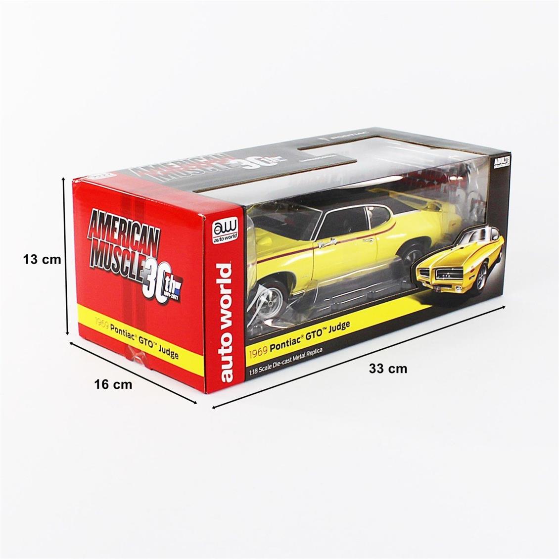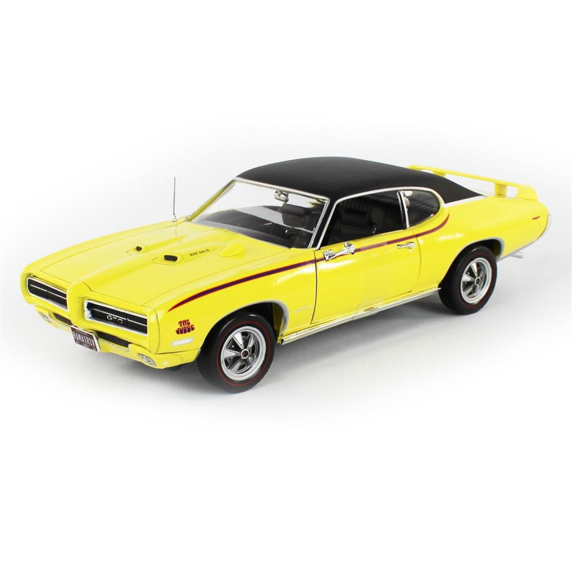 Diecast araç AutoWorld AMM1252 1/18 Ölçek, 1969 Pontiac GTO Judge, Goldenrod Yellow, Sergilemeye Hazır Metal Araba Modeli. Uzaktan kumandası yoktur. Gerçek aracın küçültülmüş halidir.